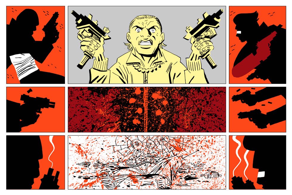 Esta composición ayuda a enfatizar la idea de que el personaje de las uzis esta rodeado, ya vemos como lo cosen a balazos de dos ángulos diferentes y con idénticas acciones.
